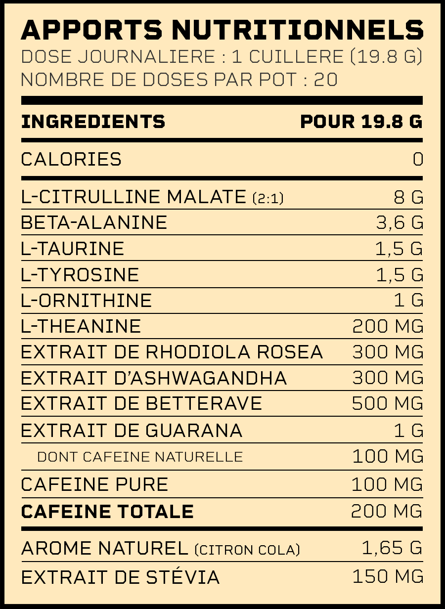 Le dosage de chaque ingrédient inclus dans ce pré-workout a été choisi en s'appuyant sur ceux utilisés lors des études scientifiques qui ont certifiées les meilleurs résultats de chaque ingrédient.